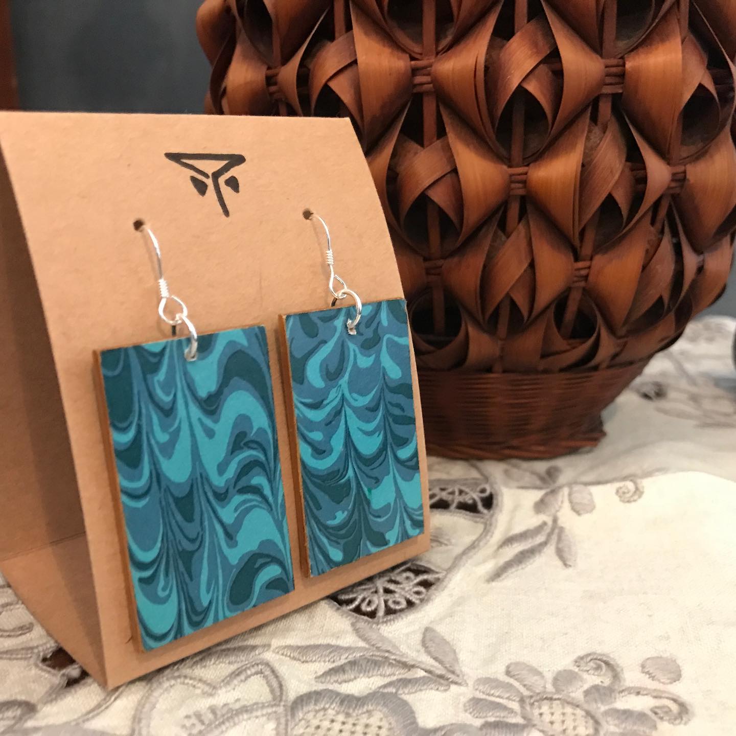 Ett par rektangulära örhängen med marmorerat mönster i turkos på båda sidor, inramade med guldfärgad kant. Örhängena är lackade för ökad tålighet. Silikonstopp medföljer. Varje par tillverkas för hand i småskalig serie med fokus på hantverk och återbruk. Eftersom mönstret varierar något blir varje par unikt.